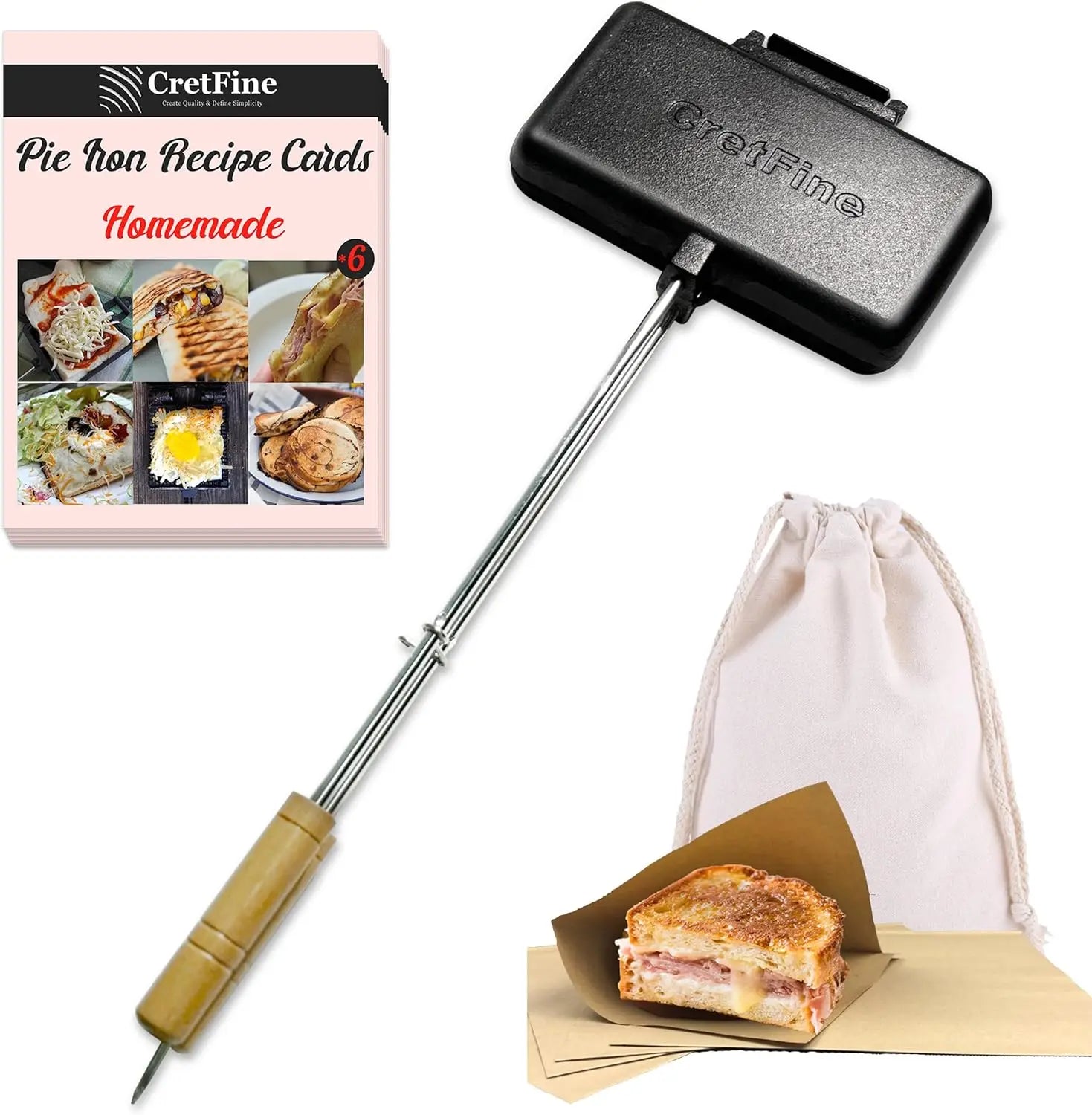 Included Components: Recipe Cards - 6 Pages, Portable Bag, Camping Pie Irons 1 Set, Food Paper Bags-20 Ct