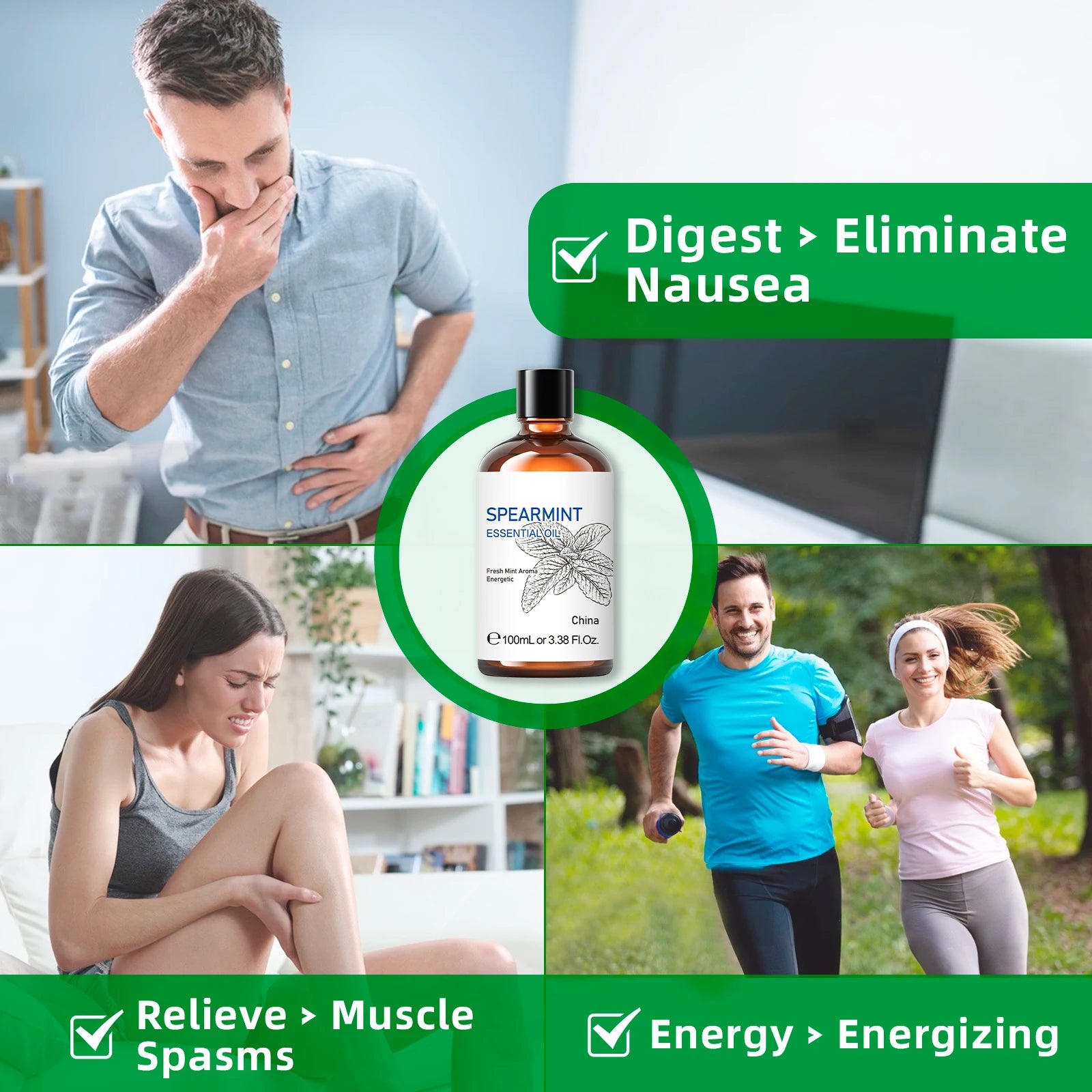 More Uses: Spearmint essential oil can be used in diffuser, spray bottles, creams, and when used on the skin it needs to be diluted with a carrier oil such as almond oil, coconut oil, jojoba oil, etc.