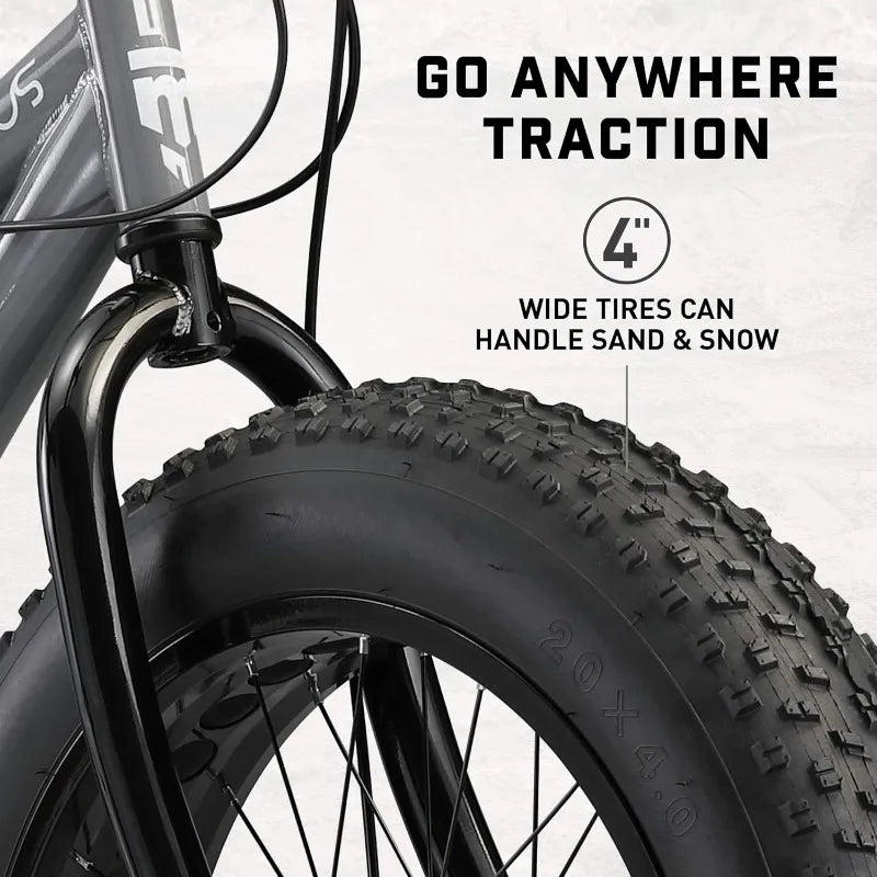 - Fat tire mountain bicycle perfect for all-terrain adventures, 20-inch wheels that fit to riders 4'0" to 5'0" tall, perfect for ages 6 and up