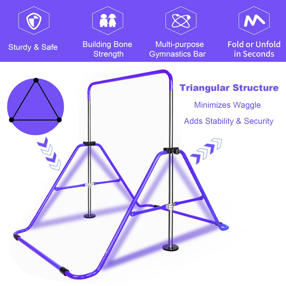 - Sturdy Construction:This Gymnastic Bar is foldable steel,tight hinge,anti-rust,high durability.The round pedestals is for better gripand stability.And the lock mechanism is easy to adjust height.The rubber rings is for better grip and slip resistance.The adjustment holes can meet different needs and skill levels.Adjustable heights from 34.8 inches to 51 inches, suitable for 99.99% of children.