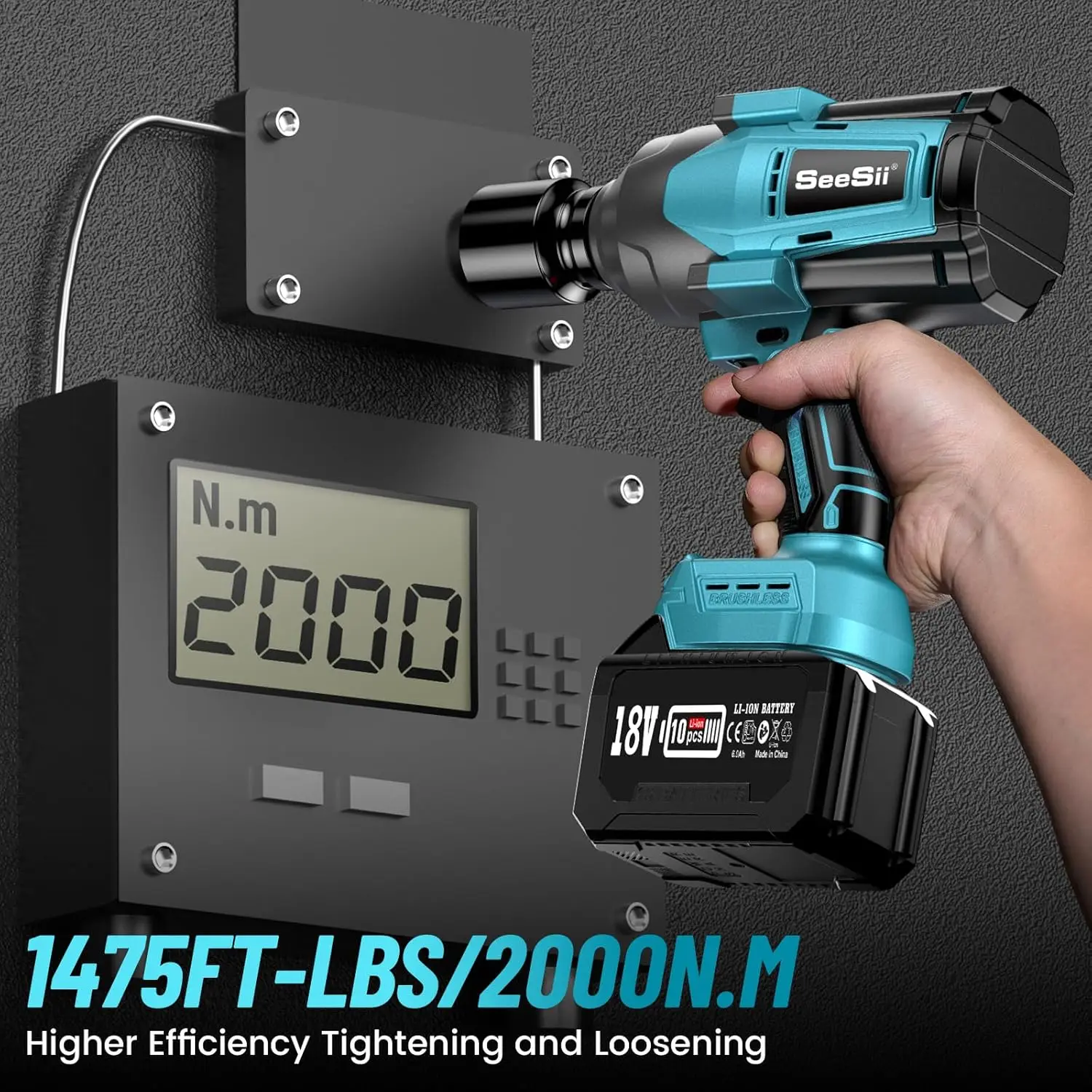 【Heavy Duty Impact Wrench 2000N.m】Seesii upgrade brushless motors deliver 1475Ft-lbs (2000N.m) of powerful torque, Effortlessly tighten or remove stubborn and rusted nuts and bolts during various occasion. Suitable for unloading car tires, car repairs, work shops, building steel structures, scaffolding, DIY carpenters, home maintenance (When using, please keep away from the elderly and children to prevent accidental injury)