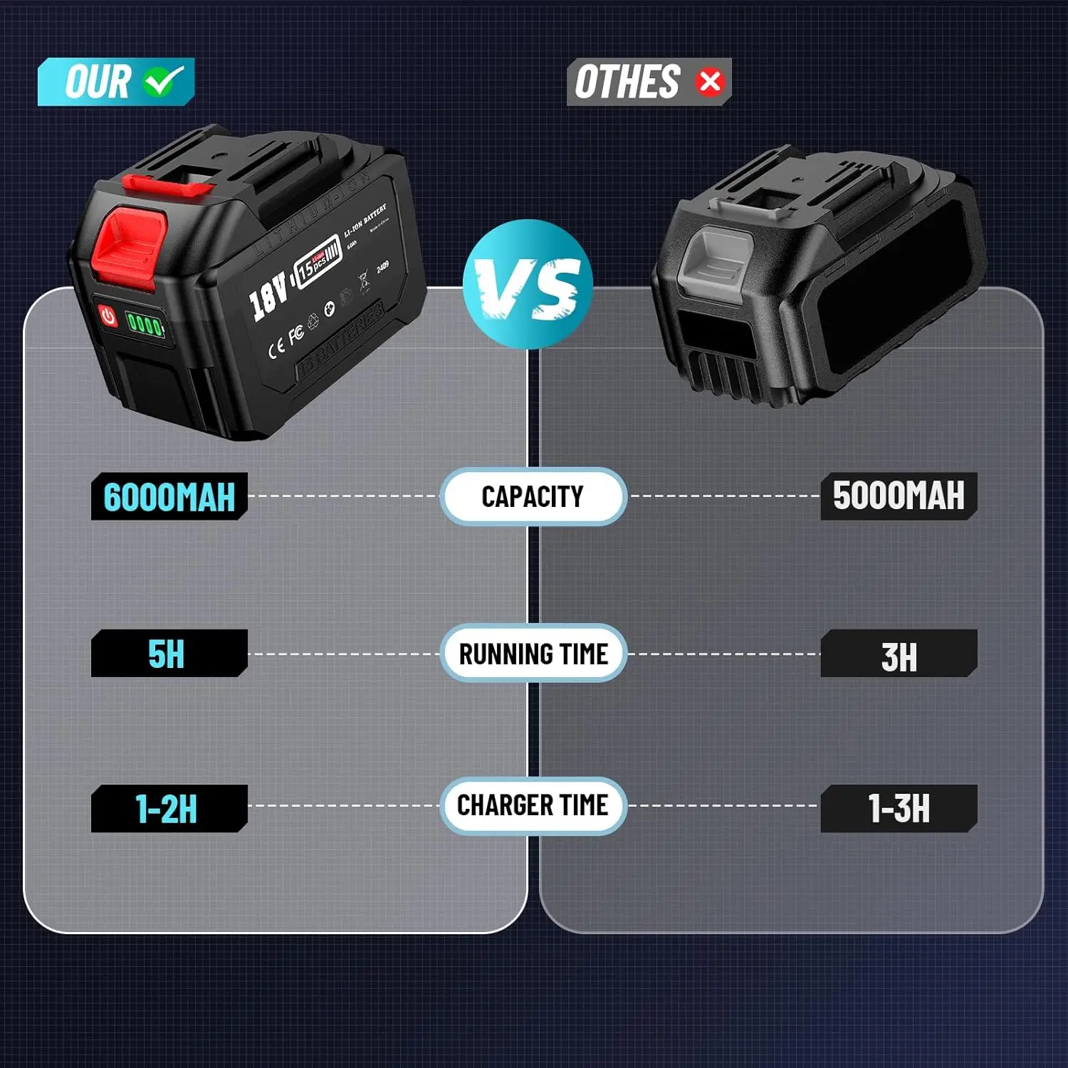 【6000mAh re-charging Battery】 It passed a rigorous 1000 charge cycle test to ensure its durability and longevity, which can extend the Electric power wrench working time by more than 40% at least compared to other 4.0Ah batteries. No need to worry about tasks not being completed before the battery runs out. It only takes 1-2 hours to fully charge. Fast charger greatly reduces battery charging time and increases your work efficiency by 50%!