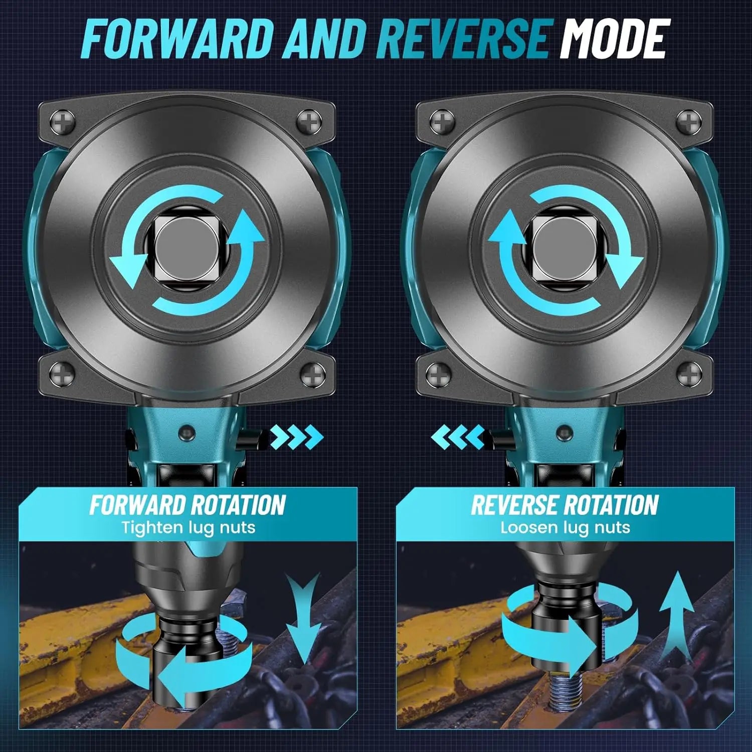 【Two Directions & Brake-stop】This power impact wrench 3/4 inch offers both forward and reverse modes with a locking protection feature. the forward mode ensures that the bolt/nutwill not loosen after tightening. In reverse mode, the brake-stop activates after loosening the nut or bolt, reducing speed and torque to prevent parts from flying off dangerously. Enjoy the added safety and protection this feature provides