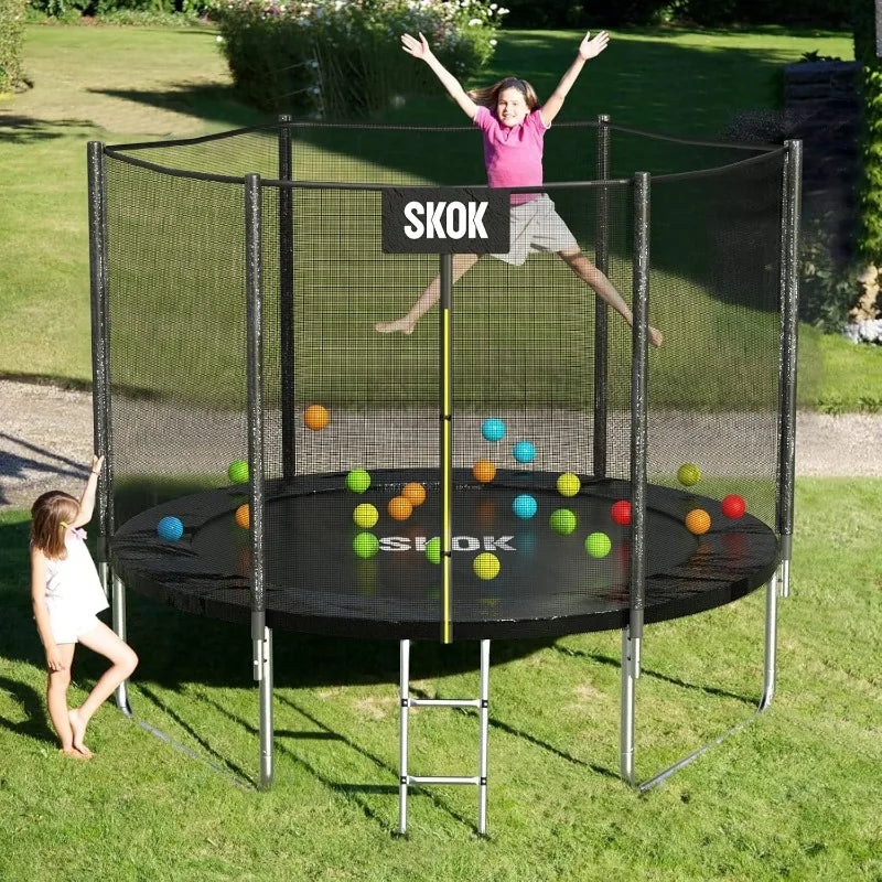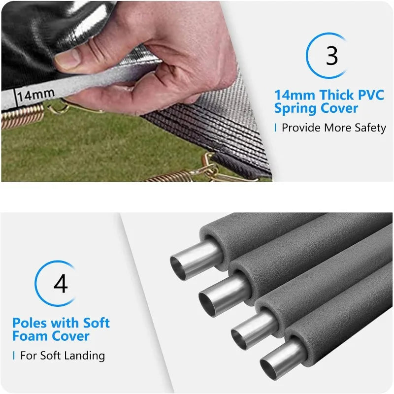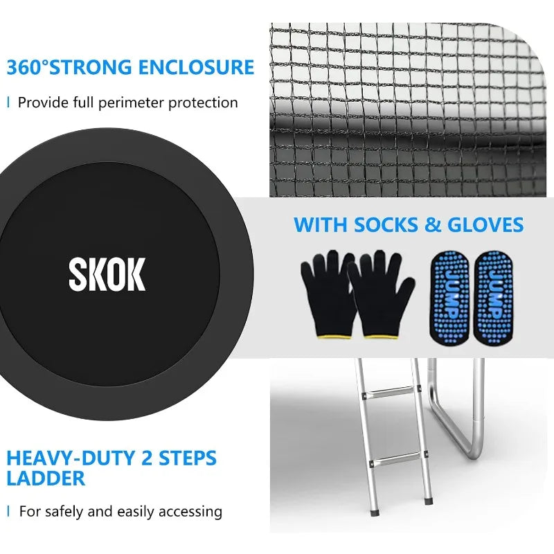 - 【360° Enclosure】To keep kids safe, SKOK black 8 foot trampoline has a 4.9ft high and strong net enclosure with a zipper & buckle safety protection combination. It also comes with 6 EPE foam and PVC-covered poles for a soft landing.The 8FT trampoline is equipped with a 14mm foam spring cover to ensure that children will not hurt their feet. Children can play happily!