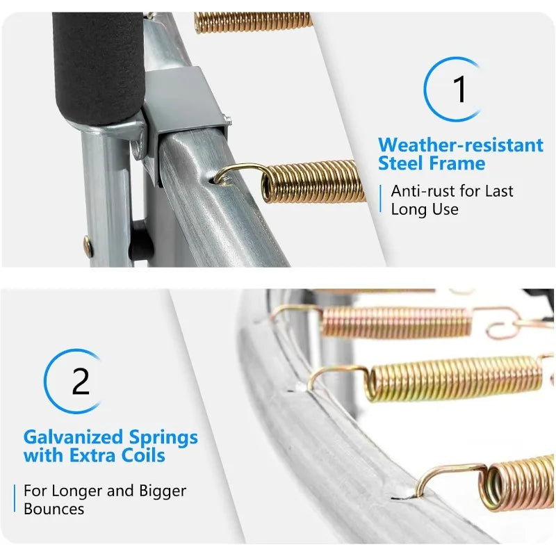 - 【Strong Frame for Last】Sturdy steel frame with 3 U-shaped Legs for more stability. All metal parts are galvanized on the inside and outside and have a wear-resistant zinc coating for extra protection against rust for a long life. Kids can jump on it indoors or outdoors, no matter in autumn or winter, spring or summer.